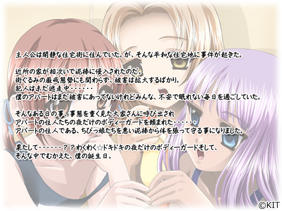 主人公は閑静な住宅街に住んでいた。が、そんな平和な住宅地に事件が起きた。近所の家が相次いで泥棒に侵入されたのだ。街ぐるみの厳戒態勢にも関わらず、被害は拡大するばかり。犯人は未だ逃走中・・・・・・僕のアパートはまだ被害にあってないけれどみんな、不安で眠れない毎日を過ごしていた。そんなある日の事、事態を重く見た大家さんに呼び出されアパートの住人たちの夜だけのボディーガードを頼まれた・・・・・・アパートの住人である、ちびっ娘たちを悪い泥棒から体を張って守る事になりました。果たして・・・・・・??わくわく☆ドキドキの夜だけのボディーガードそして、そんな中でむかえた、僕の誕生日。