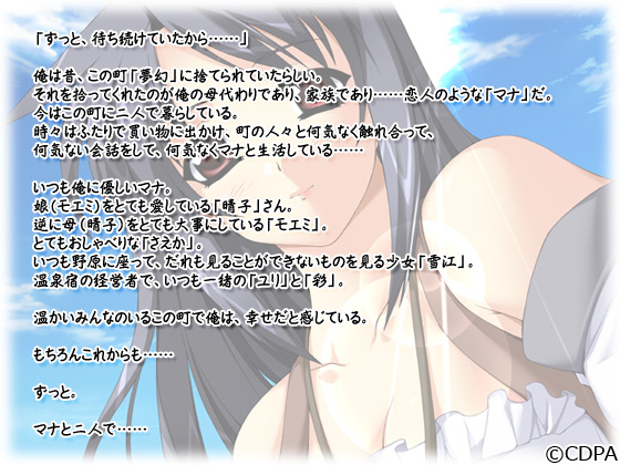 登場するヒロインは、母親のように、恋人のように、主人公と一緒に暮らしている少女、藤原マナ。好奇心旺盛で快活、おしゃべり好きの少女、日比野さえか。