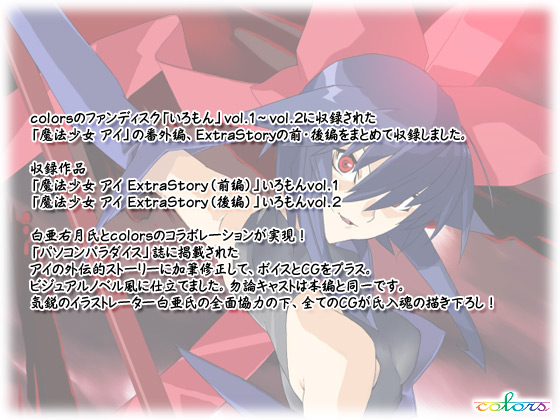 colorsのファンディスク「いろもん」vol.1〜vol.2に収録された「魔法少女 アイ」の番外編、ExtraStoryの前・後編をまとめて収録しました。