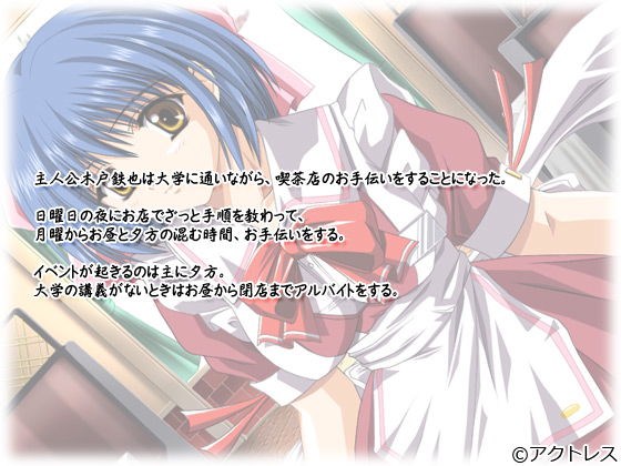 ゲームはコマンド選択型のアドベンチャーゲームです。ゲーム中のその場の雰囲気に合った選択肢を選んで行動してゆきます。ゲームの期間は2週間。プレイヤーは主人公「木戸鉄也」となって、大学に通いながら、喫茶店のお手伝いをすることになります。アルバイト中にウエイトレスの女のコ達と仲良くなるきっかけのイベントが多数あります。うまく「きっかけ」となるチャンスを生かし、女のコたちと仲良くなりましょう。
