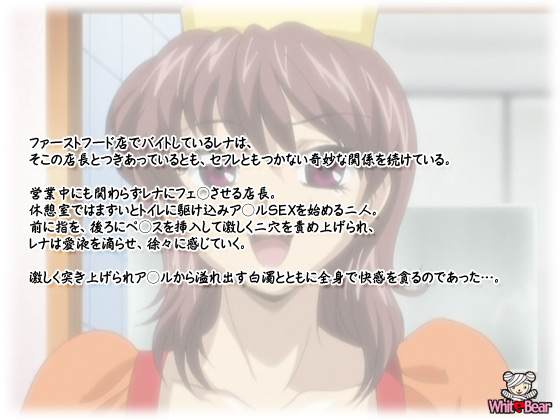ファーストフード店でバイトしているレナは、そこの店長とつきあっているとも、セフレともつかない奇妙な関係を続けている。営業中にも関わらずレナにフェ○させる店長。休憩室ではまずいとトイレに駆け込みア○ルSEXを始める二人。前に指を、後ろにペ○スを挿入して激しく二穴を責め上げられ、レナは愛液を滴らせ、徐々に感じていく。激しく突き上げられア○ルから溢れ出す白濁とともに全身で快感を貪るのであった…。