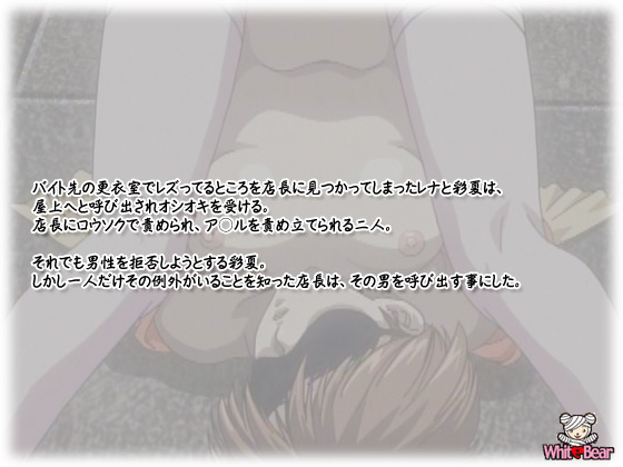 バイト先の更衣室でレズってるところを店長に見つかってしまったレナと彩夏は、屋上へと呼び出されオシオキを受ける。店長にロウソクで責められ、○縛○○され、ア○ルを責め立てられる二人。それでも男性を拒否しようとする彩夏。しかし一人だけその例外がいることを知った店長は、その男を呼び出す事にした。