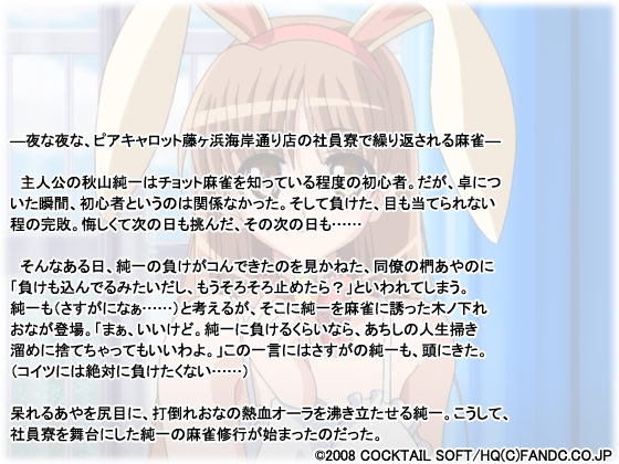呆れるあやを尻目に、打倒れおなの熱血オーラを沸き立たせる純一。こうして、社員寮を舞台にした純一の麻雀修行が始まったのだった。