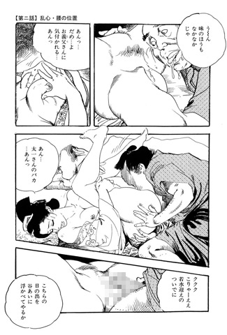 観音崎から房総への渡し舟のなか、波が荒れてくるあいだに若い女が遊び人の男に悪戯をされていた。遂に舟が転覆して、女は島に流れ着く。同じく流れ着いた遊び人の男を、気絶している間に縛り上げ、逆に弄んで復讐する女だったが…。「浮気の虫」 他に「乱心・腰の位置」「芽吹き肉」「日蕩み」「乗る土手狂戯」「生き観恩」「魚心あれば色心…」「酔狂ねばり梅雨」を収録。