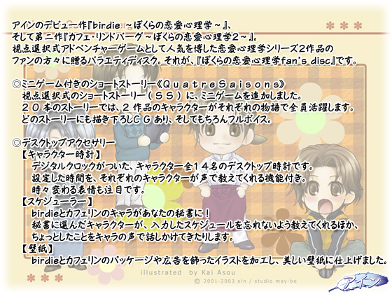 視点選択式アドベンチャーゲームとして人気を博した恋愛心理学シリーズ2作品のファンの方々に贈るバラエティディスク。それが、『ぼくらの恋愛心理学fan's disc』です。