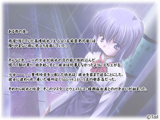 彼女に連れられ、着いた場所は「リムレット」という名の喫茶店だった。それから純也と玲奈、そこのマスターとウェイトレス・綾瀬麻由美との付き合いが始まった。