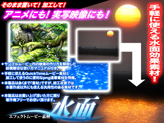 ゆらゆら、ギラギラ、キラキラなど、5種類の水面作成用の素材をセットでご提供。