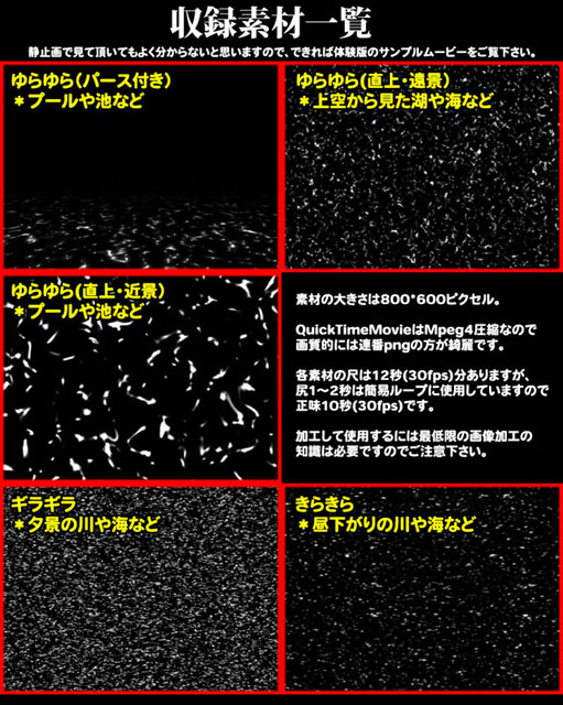 本製品が数ある素材集と決定的に違うのは、プールならプールの水面用途限定といった出来合いの素材集ではないという事。