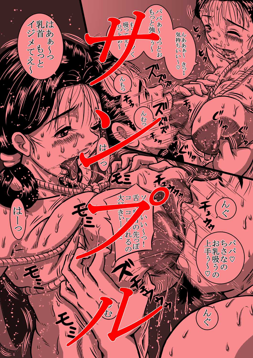 深夜…尿意で目覚め、用を足し終えた兄。暗い自宅廊下に、ふと響いた妹の喘ぎ声を耳にしてしまった彼は、明かりの漏れる父の部屋を覗き見てしまう。その目に飛び込んだ光景は、周囲に着ていた服を脱ぎ散らかし…、縄で縛りあげられた豊満な乳房を、いやらしく実の父に嬲りまわされて喜ぶ裸の妹、ちさなの淫らな姿だった。飢えた赤子のように、実の娘、ちさなの乳房にむしゃぶりつく父の姿…。嫌がるどころか、もっとイジメて!と、さらなる辱めや責め苦を、父親にねだる、ちさなの姿…。初めて見た、実の妹の真夜中のもうひとつの顔に、兄である彼は、ただ息を殺して、ふたりの繰り広げる肉欲と乳辱の狂宴に、見入る事しか出来ずにいた。母や、兄である彼の知らない所で、ちさなは実の父親と、今日も明日もひたすらずっと…、その○学生とは思えない淫らで豊かな乳房をふり乱し、ハメ狂い続けることだろう…。