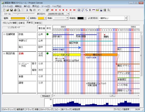 Project Canvasは、「スケジュール線表エディタ」です。美しい線表(工程表、ガントチャート)を自由に作成することで、プロジェクト管理や日々の業務を強力に支援します。デザイン的にも、色づかいなどを含めユーザーの好みによって多彩な線表を作成可能です。