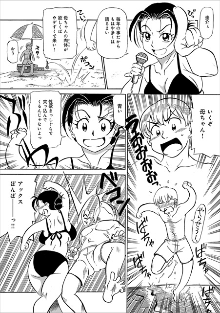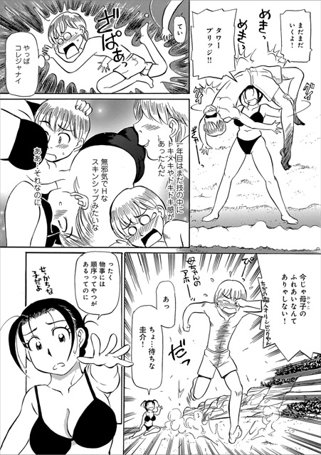 毎年、人気のない海岸で思いっきりプロレス技をくりだしてからエッチ三昧の母と息子。