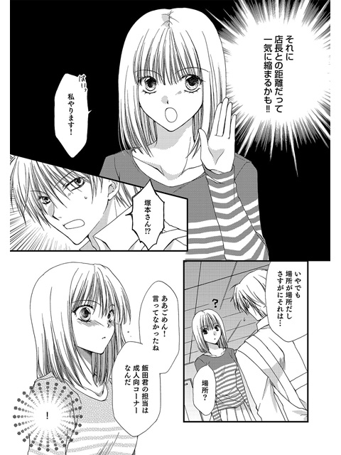 遥はバイト先の本屋の店長・中村に片思い中…だけど、なかなか接点がなくてお近づきになれない。シフトで困る店長に、ここで名乗り出れば好感度アップ出来てふたりの距離は一気に縮まっちゃうかも!って思ったら、担当先がまさかの成人向けコーナーで…!?