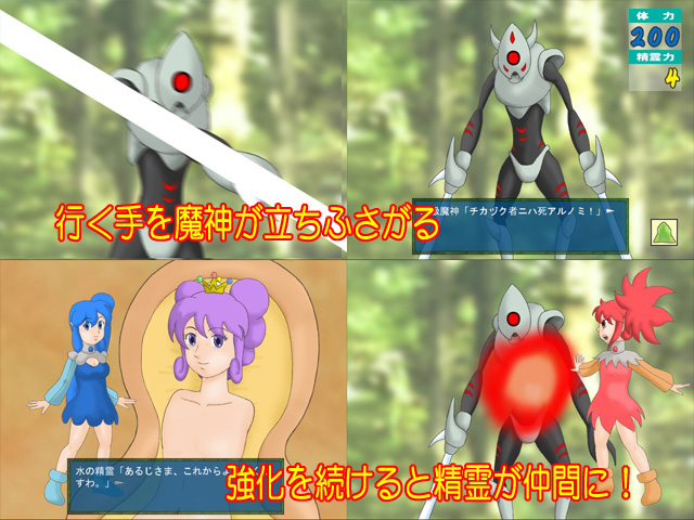 魔神を倒し封印された精霊女王の身体の部位を取り戻すゲームです。
