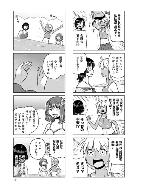 修学旅行中の女子高生3人が目覚めると、そこは見知らぬ無人島だった…!「琴浦さん」の作者が描く○○サバイバル4コマ、第一弾登場。