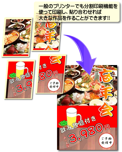 「分割印刷機能」で、一般のA4プリンターでもポスターなどの大判風の印刷物が作成できます。指定した分割枚数に合わせて拡大して印刷されますので、後で貼り合わせれば、ポスターのできあがりです。