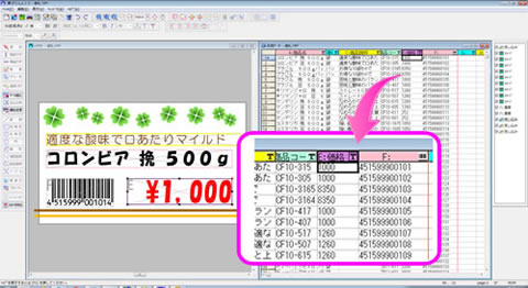 データベースから数値を流し込んでバーコードを自動生成させることもできますので、商品管理ラベルや、バーコード入りのプライスカードなどもお気軽に作成できます。