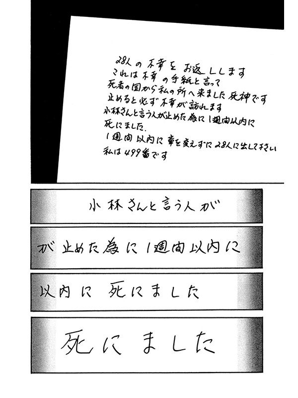 小説家を目指すひとみの元に、不幸の手紙が届く。