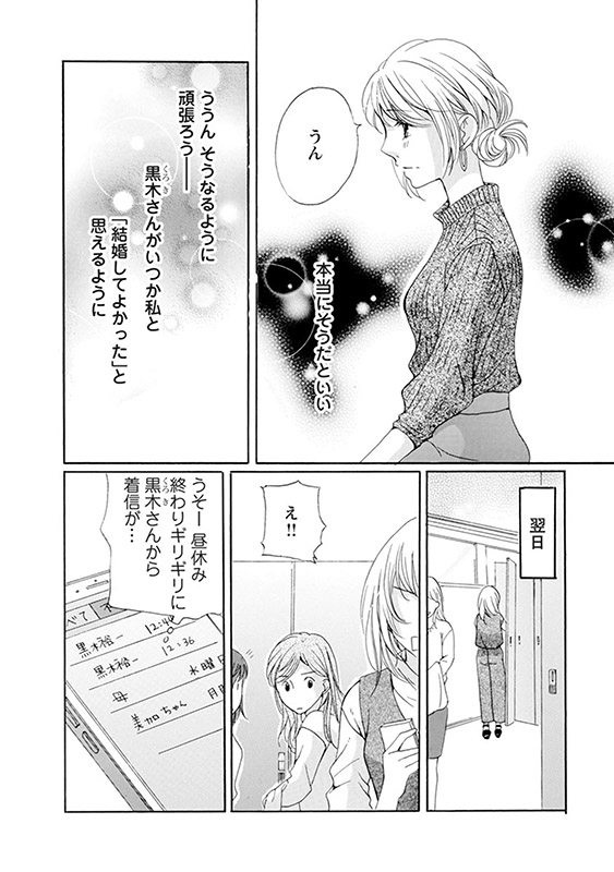 ひとり苦しむ里英のもとに、なぜか会社の上司が突然、見合い話をもってくる。相手は寧史が唯一、ライバル視していた黒木裕一。端整な顔立ちとその有能さで社内でも一目置かれる黒木は、見合いの席で言い放った。