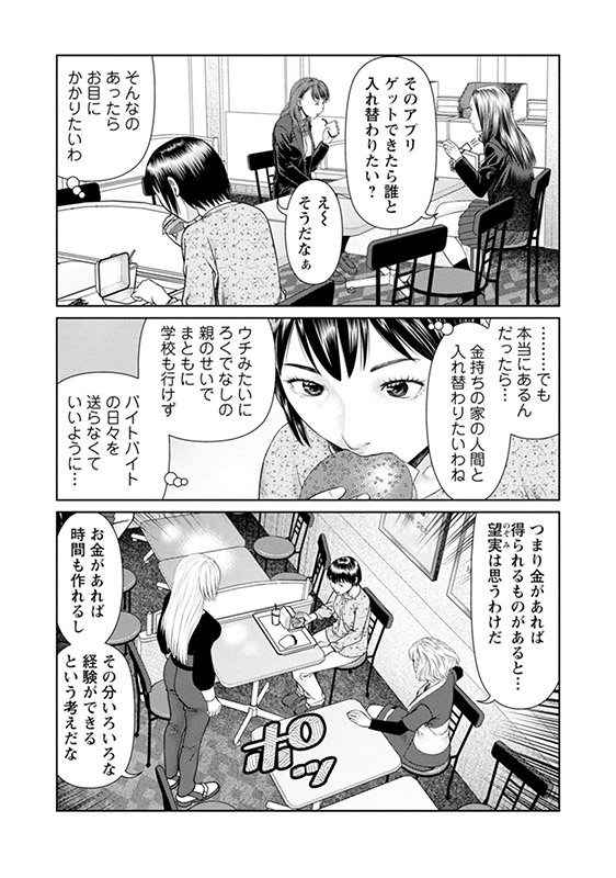 数ある都市伝説の一つにこんなものがある。男女の仲や雇用をマッチングするのではなく、別の人生を望む者同士をマッチングさせ中身を入れ替えるアプリが存在するのだと。 謎の高位存在に導かれ、互いの人生を交換した者たちは、新しい生活の中でいったい何を見て、どのような運命をたどるのか──? ※ 毒りんごcomic : 69 収録作品