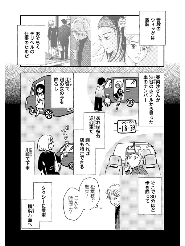 ”雪菜”の後をつけて、亜梨沙が普段ウィッグをつけているのはデリヘルの仕事のための変装だと確信した一条。