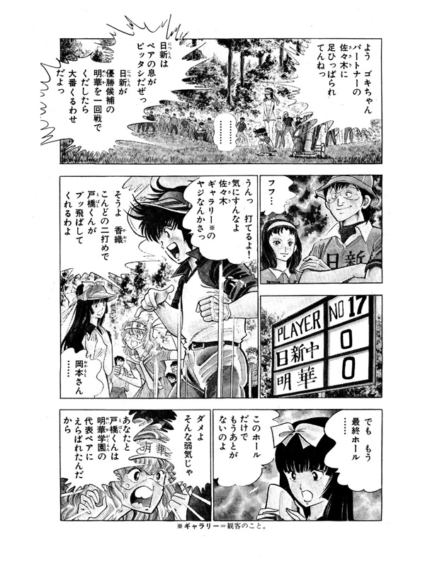 全日本中学校フォアサムゴルフ選手権!各校激しい勝敗争いを繰り広げていた。そんな中、『明華学園』対『日新中学』の勝負もかなりの接戦で優勝候補と言われながらも、明華学園の戸橋・佐々木ペアは苦戦し、最終ホールにくるまで決着はついていなかった!