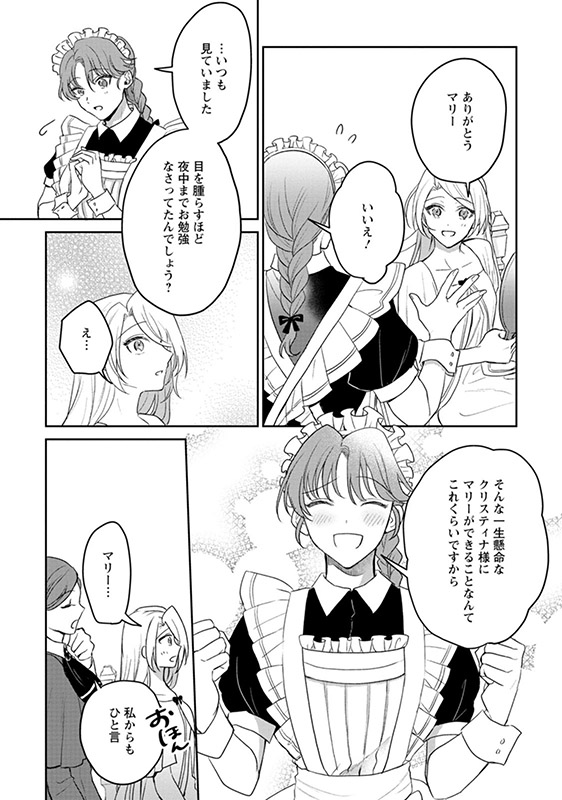 死の未来を回避するため、強かに生きる決意をしたクリスティナ。婚約者・イリルに己の時が戻ったことを明かし、彼の協力を得ることに成功する。