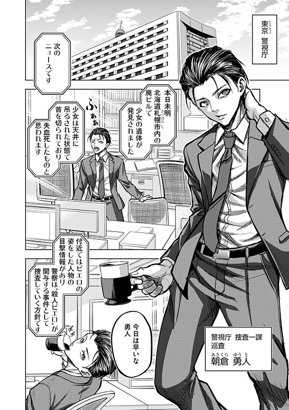 20XX年。 国民がICチップで管理され、犯罪者の特定・逮捕が容易になったにもかかわらず、 全国各地で正体不明の○人鬼による○○を狙った凄惨な○人事件が起きていた。 黒いマント・ピエロの仮面に身を包み、 殺害対象に「質問」を投げかける狂ったシリアルキラー――「○人ピエロ」と、警官・朝倉勇人の戦いが始まる!