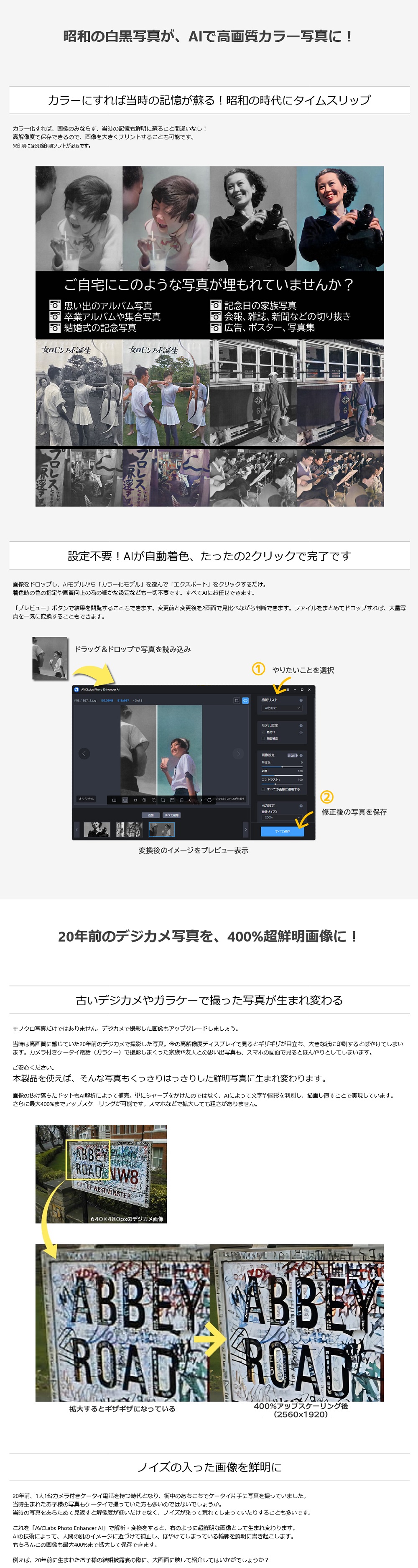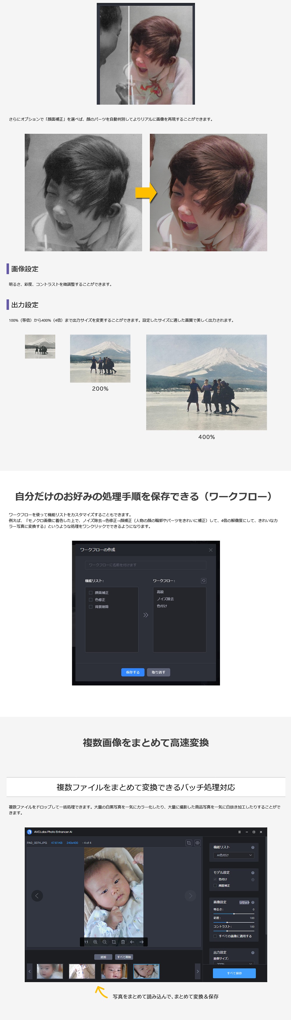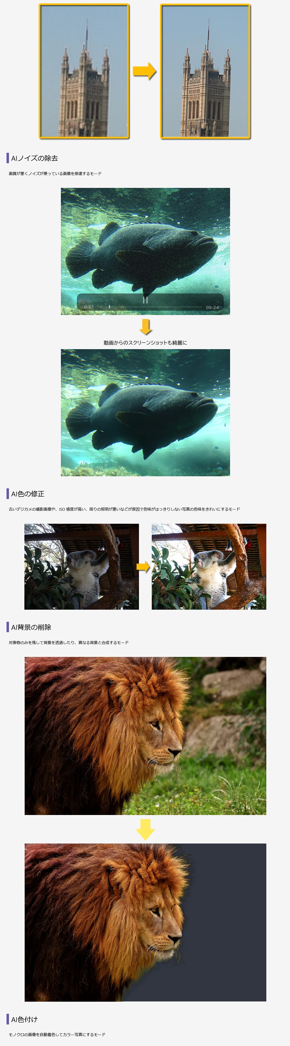 「AVCLabs Photo Enhancer AI」は、画像加工の3大人気機能を搭載した究極の画像加工ソフトです。