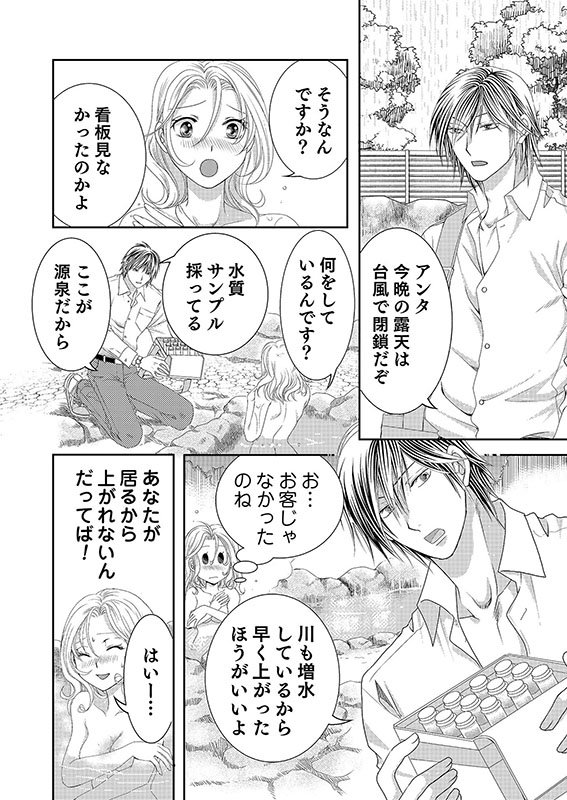 事の起こりはほんの一時間前、旅先で台風に見舞われた私はうっかり雨天閉鎖の露天風呂に入ってしまう。だけど女湯に何故か男性の姿が!その人は水質サンプルを採っていただけなんだけど、彼がいるせいでお湯から上がれない!そうこうしている内に大雨の影響で土砂崩れが起こり、私たちは露天風呂に閉じ込められてしまった!私、全裸なのに〜〜っ!!