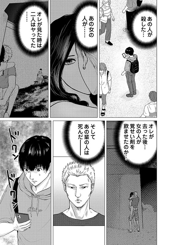 橋の下で○姦している男女を目撃し盗撮してしまう、平凡な男子大学生・大森聡。その男の足にはタトゥーが入った輩系で絡まれないようにと帰宅する。大興奮して友人の佐竹要に報告するも軽く流されてしまうが、その翌日、足にタトゥーの入った男の遺体が河川敷で発見される。そんな中、友人・要に勧められ出会いアプリを始める聡。知り合ったのは一見美人だがヤバい人妻だった!しだいにその人妻の虜になっていき──…!?偶然、○姦を目撃した大学生に巻き起こる扇情的かつ衝撃の不倫サスペンス!