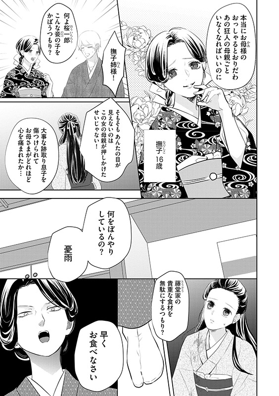 特に腹違いの姉・撫子(なでしこ)は、好意を寄せている慎之介(しんのすけ)の前では憂雨と仲のいいふりをしつつ、陰では徹底的に憂雨をいじめていた。
