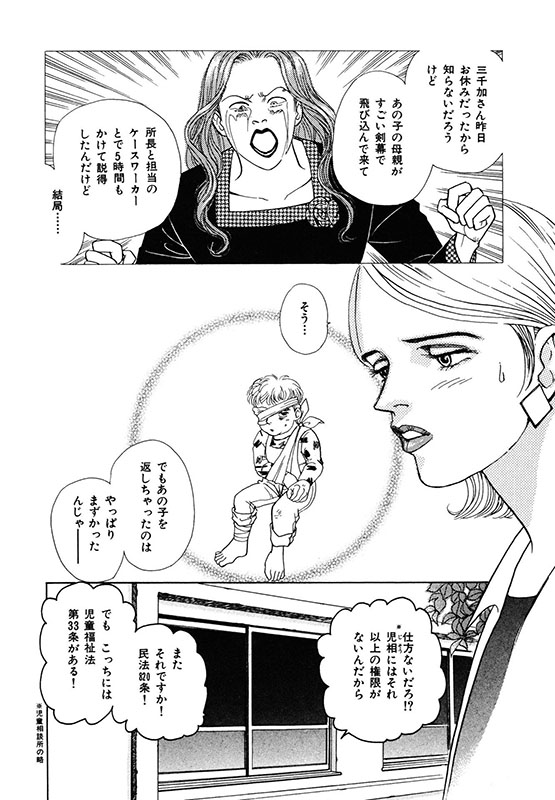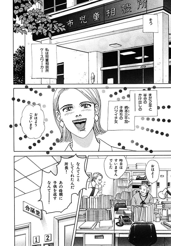 柄本三千加(えもとみちか)は駆け出しの○○相談所ケースワーカーで、子持ちのバツイチ。○待を受けている疑いのある男の子を保護していたが、ある日その母親が「息子を返せ」と物凄い剣幕で怒鳴り込んできた。