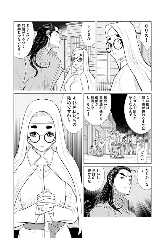 街はずれの廃墟内で男がふたり、剣をまじえようとしていた。方や鋭い突きが目にも止まらない速さの男、対峙しているのはその剣を鞘に収めたままの男……次の瞬間、稲妻のような一閃! 突きは空を切り、男の身体は真っ二つ! 生き残った男は大きなナタで○体の首をはねた……。
