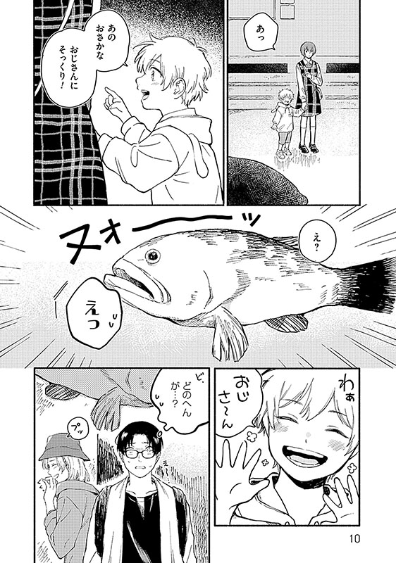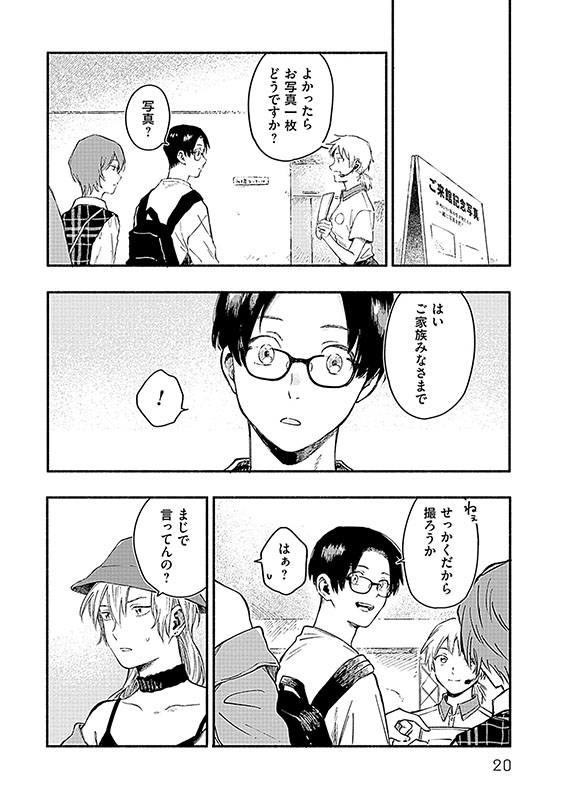 4人で訪れた水族館での記念撮影。旺志郎は父親、女物の服で身を飾る姫は母親、楽夢と真里央はふたりの○○に。