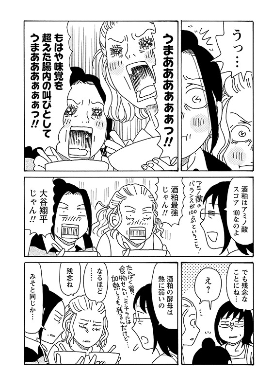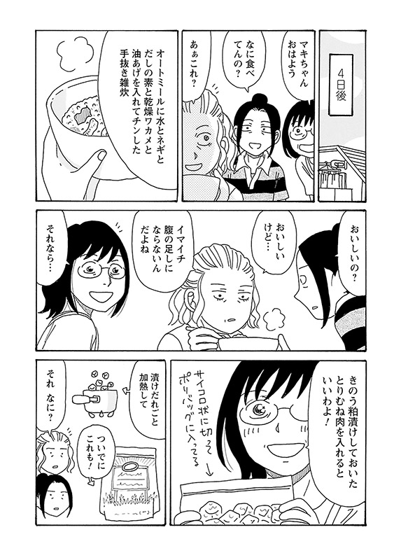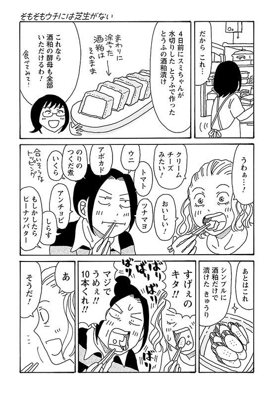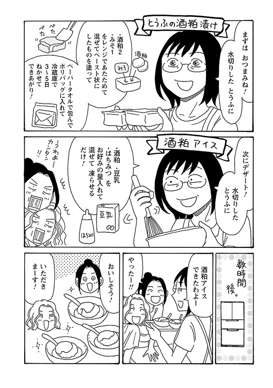 元カレの結婚式二次会に乗り込んだ結果、思いがけないサプライズに遭遇したり、カネという名の血が止まらない状況下で行うキャンプ中に、完ペキな隣人・辻さんの秘密を知ることになったり、とうふバー、酒粕、オートミールの美味しいプレゼンバトルが開催されたりする今巻も、内容充実、感情大爆発!