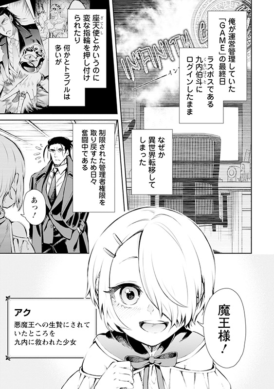 自らが運営するゲームの最強キャラ「魔王」にログインしたまま異世界へと飛ばされた大野晶。噂はすぐに広まり、魔王を討伐しようと聖女や騎士団に追われる日々が始まった! 果たして元の世界に戻れるのか──!?