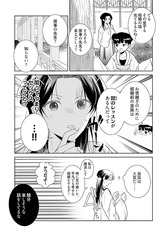 第二の人生は皇子付きの侍女として、仲よしの同僚と楽しく働く毎日です。そんなある日舞いこんできたのは、皇子からの「閨(ねや)のレッスン」の依頼。
