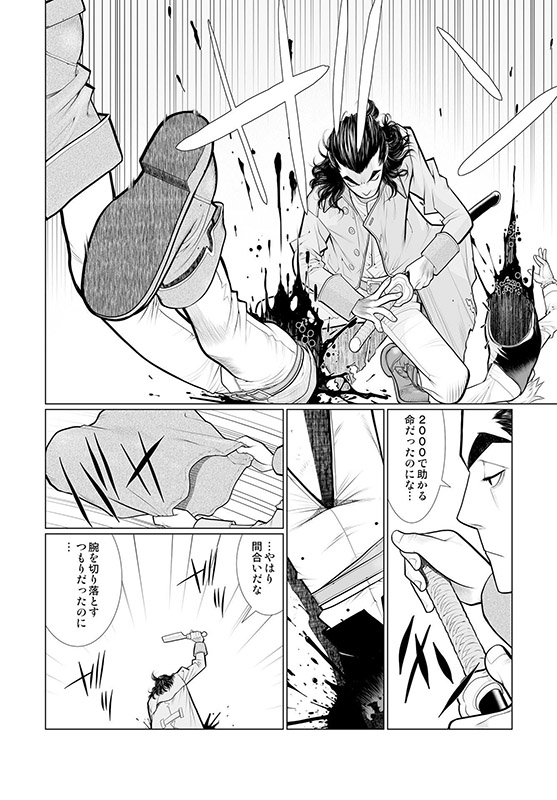 片や鋭い突きが目にも止まらない速さの男、対峙しているのはその剣を鞘に収めたままの男……次の瞬間、稲妻のような一閃! 突きは空を切り、男の身体は真っ二つ! 生き残った男は大きなナタで○体の首をはねた……。