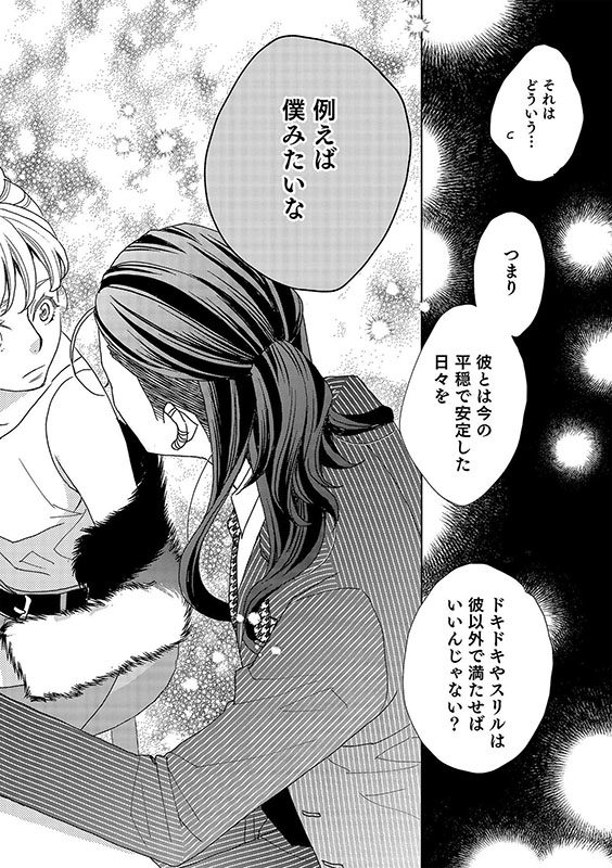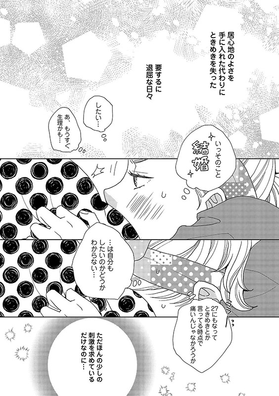 27歳売れないフリーライター、冴えない日常を繰り返す事に、私は少し飽きていたのかもしれない──。大学時代に付き合い始めた太一との同棲生活も、もう5年。太一は優しいし、私の仕事に理解があるし、とてもいい彼氏。だけど最近はレス気味。居心地は良いけれど刺激の無い毎日。そんな折掛かって来た1本の電話。その誘いに乗らなければ、このまま退屈だけど平穏な日々が続いたのかも知れない。