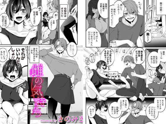 静希(しずき)は失恋話を肴に、幼馴染・葵(あおい)の家で宅飲み。女性をリードするのが苦手で受け身な彼に、同人作家でもある葵は女装を提案。オフショルスカートニーソに初めて身を包んだ彼を見て、葵はウキウキ!「可愛い顔するから我慢できなくなっちゃった」女が喜ぶ言葉と共にスカートの中をまさぐり押し倒すと、静希の膨らんだ股間が太ももに当たる。まさかの反応に驚くも、溜まっていたならしょうがない。スカートの上から亀頭をカリカリ。たまらず静希も葵の乳首を弄り性器に手を忍ばせるが、金玉さわさわ亀頭責め手コキに悶絶。しかし葵のひょんな一言で静希は冷静に。幼馴染と過ちを○すわけにはいかない。だが、その決意はあっけなく砕かれる。