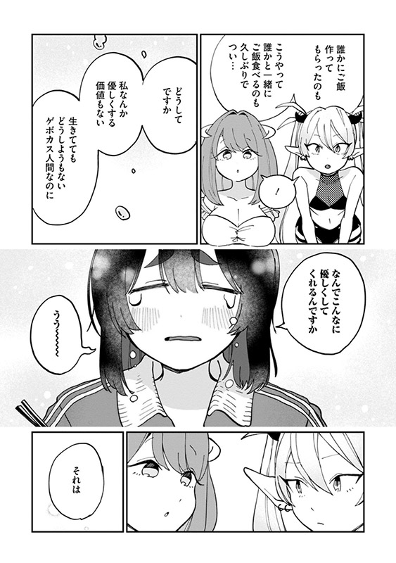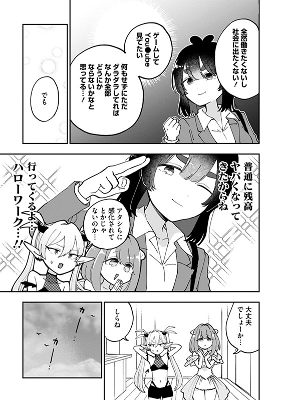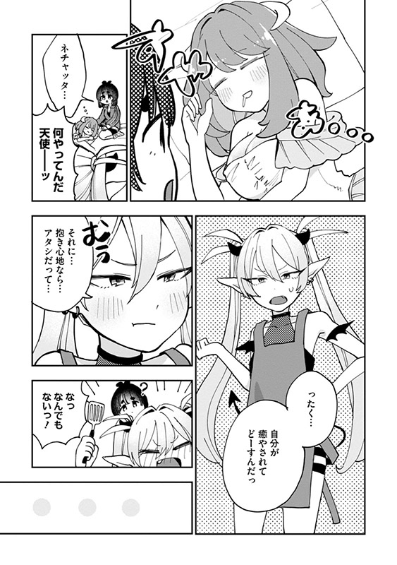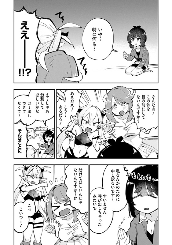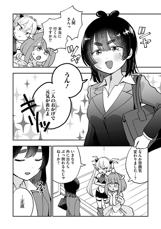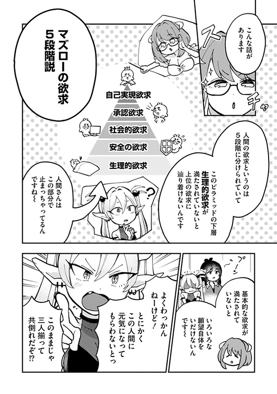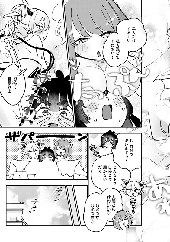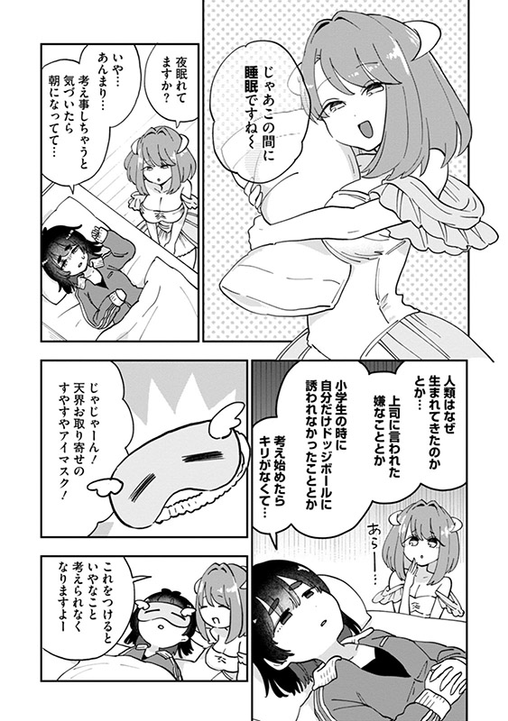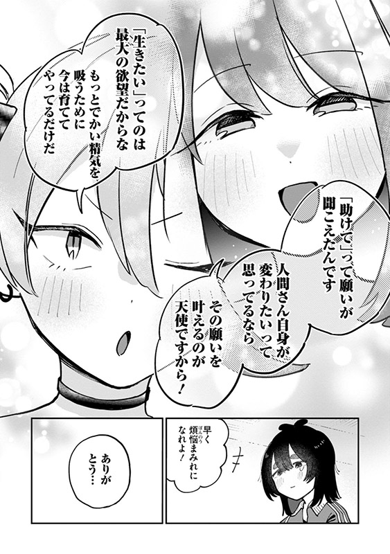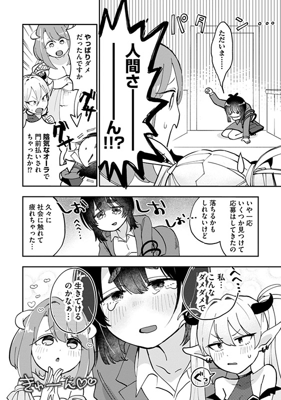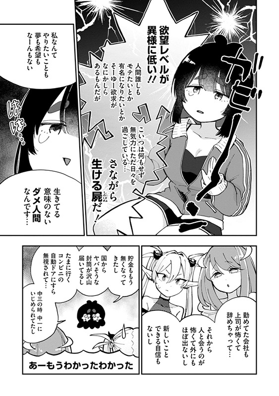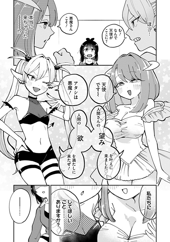 仕事を辞めて3ヵ月、何もやる気が起きぬままただ漫然と日々を過ごしていた人間さん。気力の無さに危機感を覚えたその時、目の前に天使と悪魔が現れた!! 彼女たちは人間さんの望みや欲を叶えてくれるというが、人間さんの欲望レベルは異常に低くて…!? 欲を満たしたい天使と悪魔 vs. 無気力人間の誘”欲”デイズが始まる!!