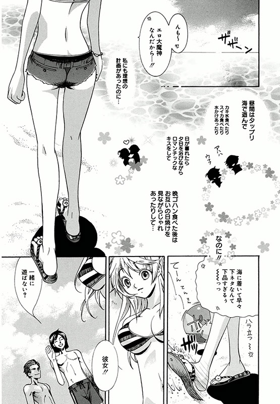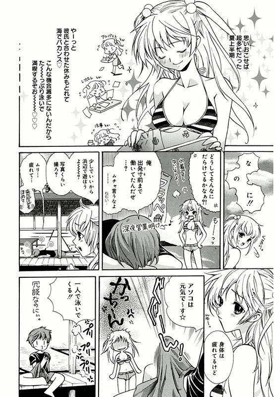 彼氏と海に来たものの、仕事明けでダウンした彼氏に腹を立てて一人でビーチに出たら、ちょっとカッコイイ男の子達に声をかけられて、いい気分で遊んでいるうちにいつの間にか裸にされて「どんな体位でもとれる水中セックス」や「はじめての前後同時繋がりえっち」をみんなの「イーンラン」コールとともに○○体験。特に、男の子にしがみついたまま、海に落ちないように太い二本で串刺しされての3Pは……。