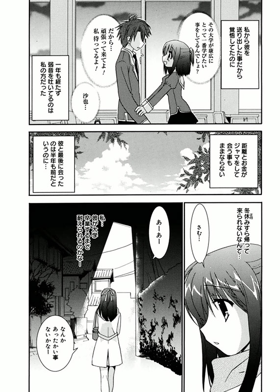大学に入ってすぐに遠恋になってしまった私と康広。お互いのさびしさと身体を癒すためにテレフォンセックスばかりしていたけど、さびしさは埋めきれない。しかしある日、突然康広が逢いに来てくれて……。人肌の温かさに加え、受話器越しで命じられていたことを繰り返していたせいか以前よりはるかに敏感に、かつ感じるようになっていた私。アソコを舐められるごとに電流が走り、我慢しきれなくなって自分から恥ずかしいおねだり。