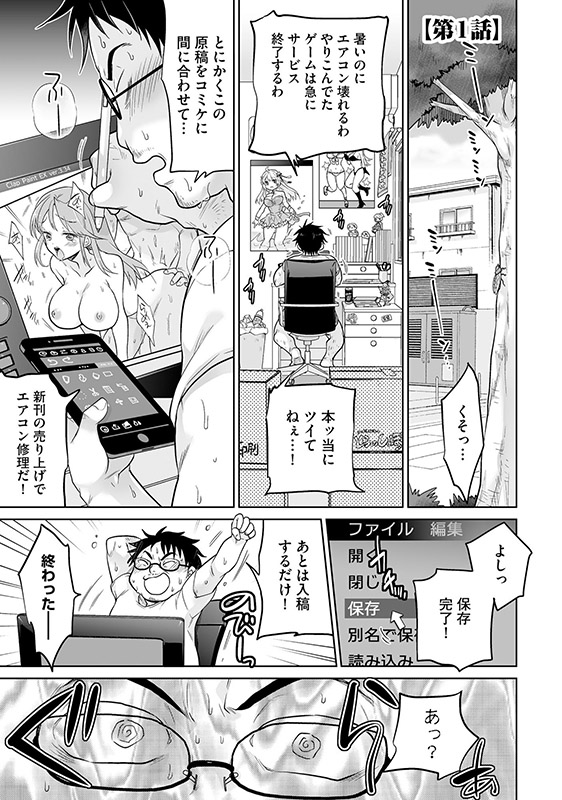 同人マンガを描き上げた瞬間、無理がたたったのかあの世へと召された主人公。