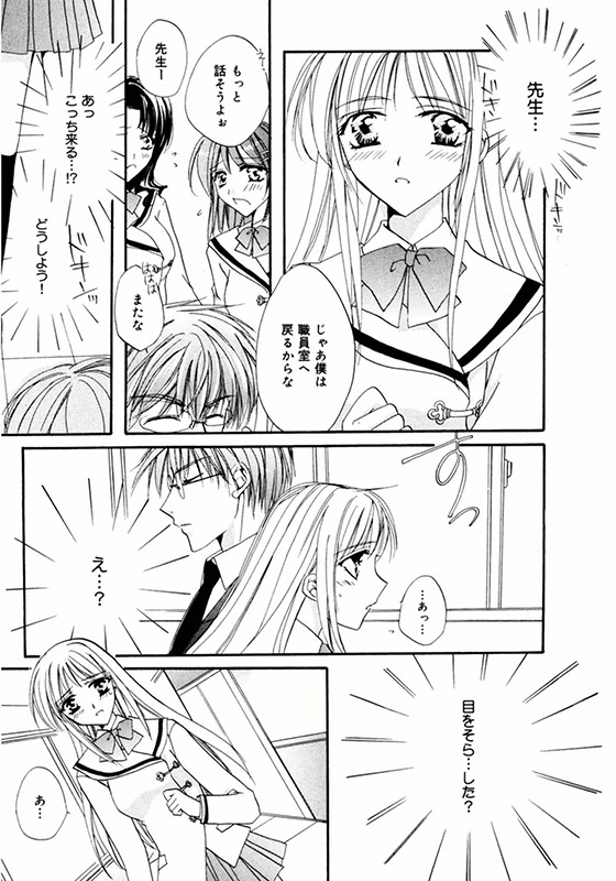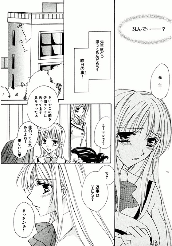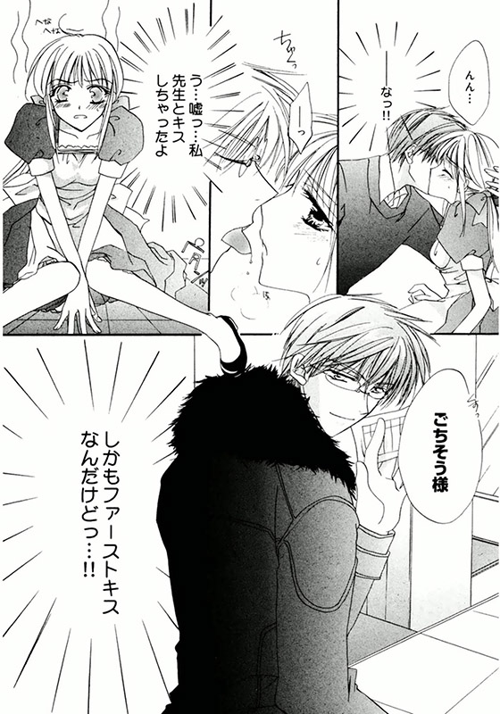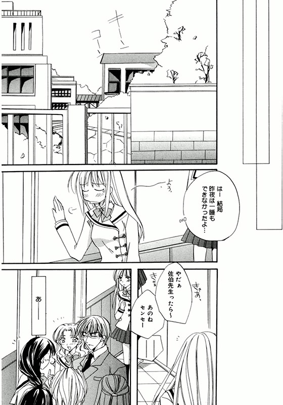 一睡も出来なかった私は、次の日バイト先に先生が来なかったことにホッとしたりさびしく思ったりフクザツだったけど、バイトが終わったら先生が外で待ってて「送ってく」。先生の気持ちがわからなくなった私は、思わず「これ以上からかわないで」と泣きながら訴えたら、先生に今度は息も止まるほどの本格的なキスと気持ちを打ち明けられる。