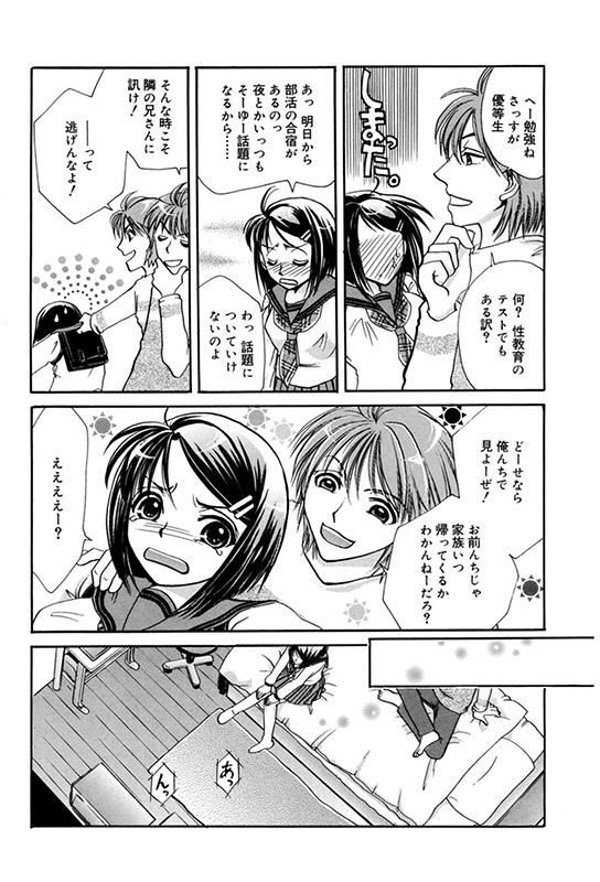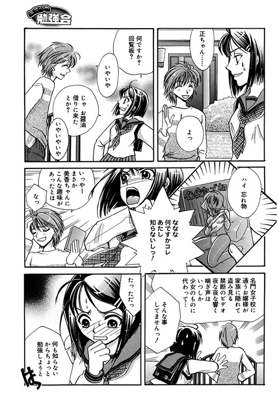 友達との旅行の前日、日頃からみんなのHトークについていけなくて、少し「予習」しようとそっと訪ねたビデオレンタルショップ。ところがそこで出会ったのはお隣の幼なじみのお兄さんである正。思わず借りようと思ってたアダルトビデオを置いて逃げ出しちゃったけど、結局はお兄さんの家で一緒に観ることに。