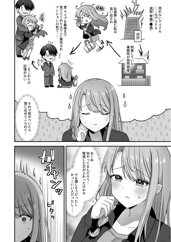 《本作品は同人誌です》「新人アイドルとして、何か心がけてることはありますか?」「とにかく『今を』頑張るしかないかなって!『今を』頑張っていけば、いつか、もっと素敵な未来が待ってるから!」…と頑張っていたけれど、所属していた事務所が倒産。社員寮を追い出され、途方に暮れていた琴葉に、一人の男が声をかける。