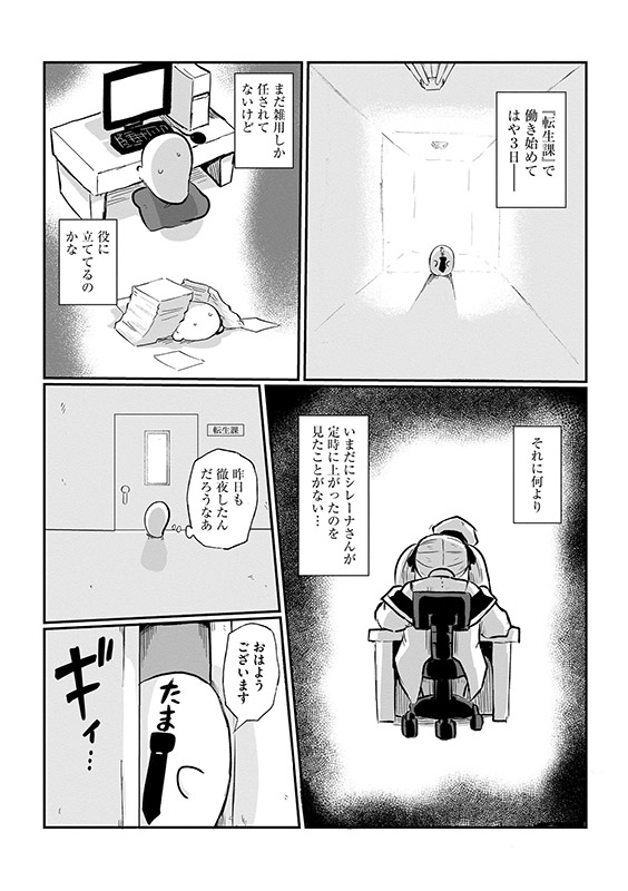 急増していく転生者人口問題の対応、日々の雑務に来週の社内コンペの準備まで“ワンオペ”で業務をこなしていく……。