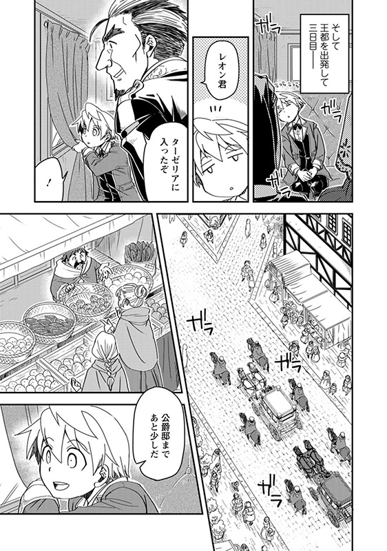 宰相のリシャールに公爵家に行かないかと誘われたレオン。公爵領が海に面していることを知ったレオンは、海産物を食べられることを期待して公爵家へ向かう。道中に少々問題は発生したが、無事公爵家に到着。そして、公爵のクリストフやその家族に挨拶をすませて、談笑しているとレオンの能力の話になり、実際に見せることに――。