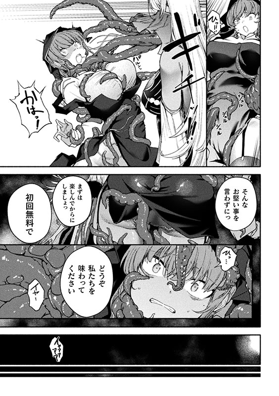魔族娼館を取り締まりに来たシスターが触手地獄で快楽堕ち! 街の人間を次々と堕落させていると噂の魔族娼館へ文句を言いにきたシスター・マリーゴールドは、娼館の風俗嬢・トゥルコに出迎えられ、彼女はすぐさま閉館を要求するが、娼館の楽しさを説くトゥルコによって全身を触手で捕らえられてしまう。されるがまま口に触手を押し込まれ、豊満な胸を無数の触手で侵されるマリーゴールドは、弱点を探るようにまとわりつく触手に身体の隅々までねちっこく責められ、次第に快感が押し寄せる。そんな中、必至の抵抗を示しながら神に助けを乞う彼女だったが、秘部から愛液が溢れ出し、自ら快楽に溺れたがっていることをトゥルコに看破されてしまう。そして、神への背反で失意のどん底にたたされた彼女はトゥルコの触手で処女を奪われ、容赦のない追い打ちをかけられ、絶頂間際で寸止めされ生殺しのまま返されてしまう。翌日、すべてを失ったマリーゴールドは、トゥルコに自ら慰めを懇願し、快感に溺れていく――。
